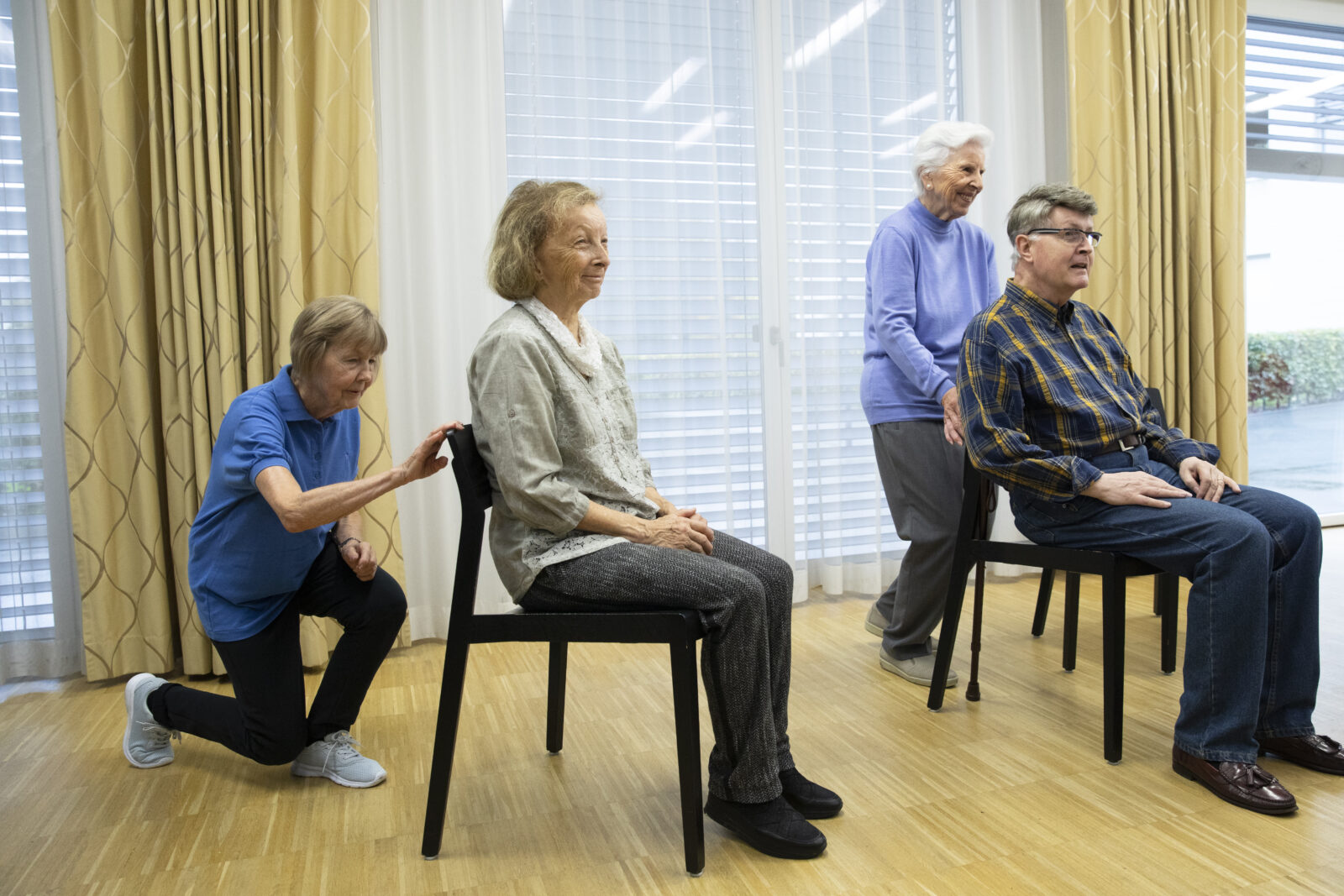 Sicherheitshalber den Stuhl hinter sich stellen und sich mit flacher Hand auf einer sicheren Fläche abstützen. Nun langsam so weit wie möglich in die Knie gehen und wieder aufrichten. 5 bis 10 Mal wiederholen.