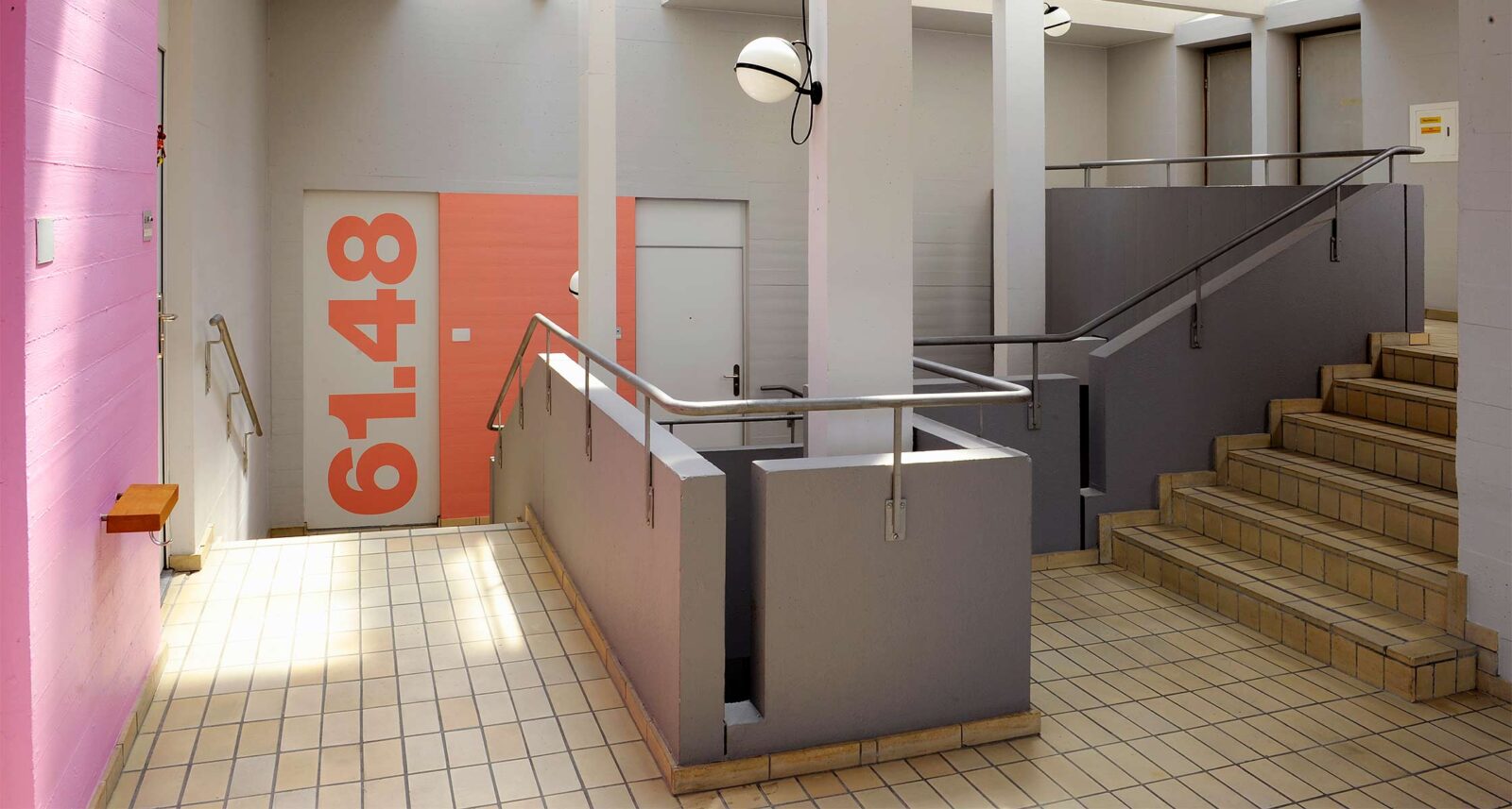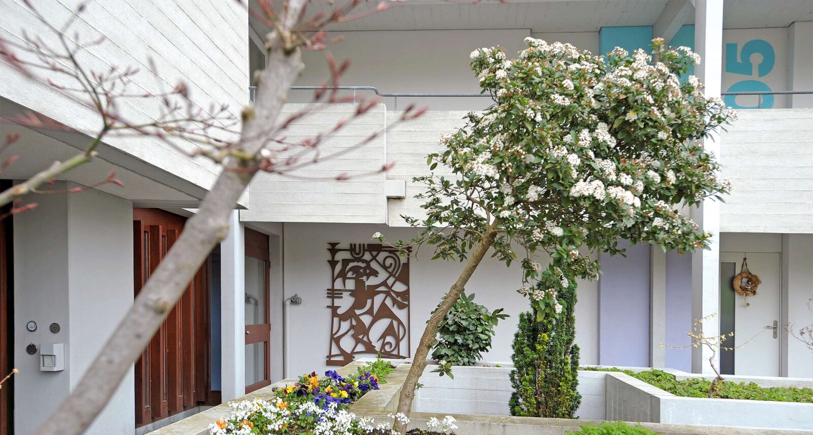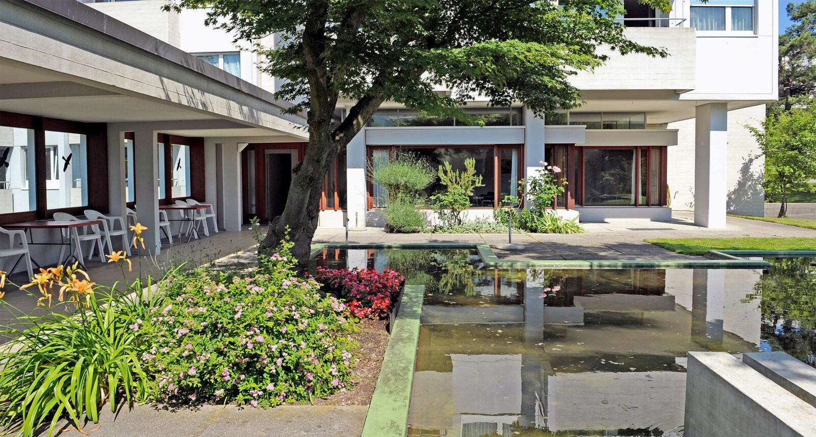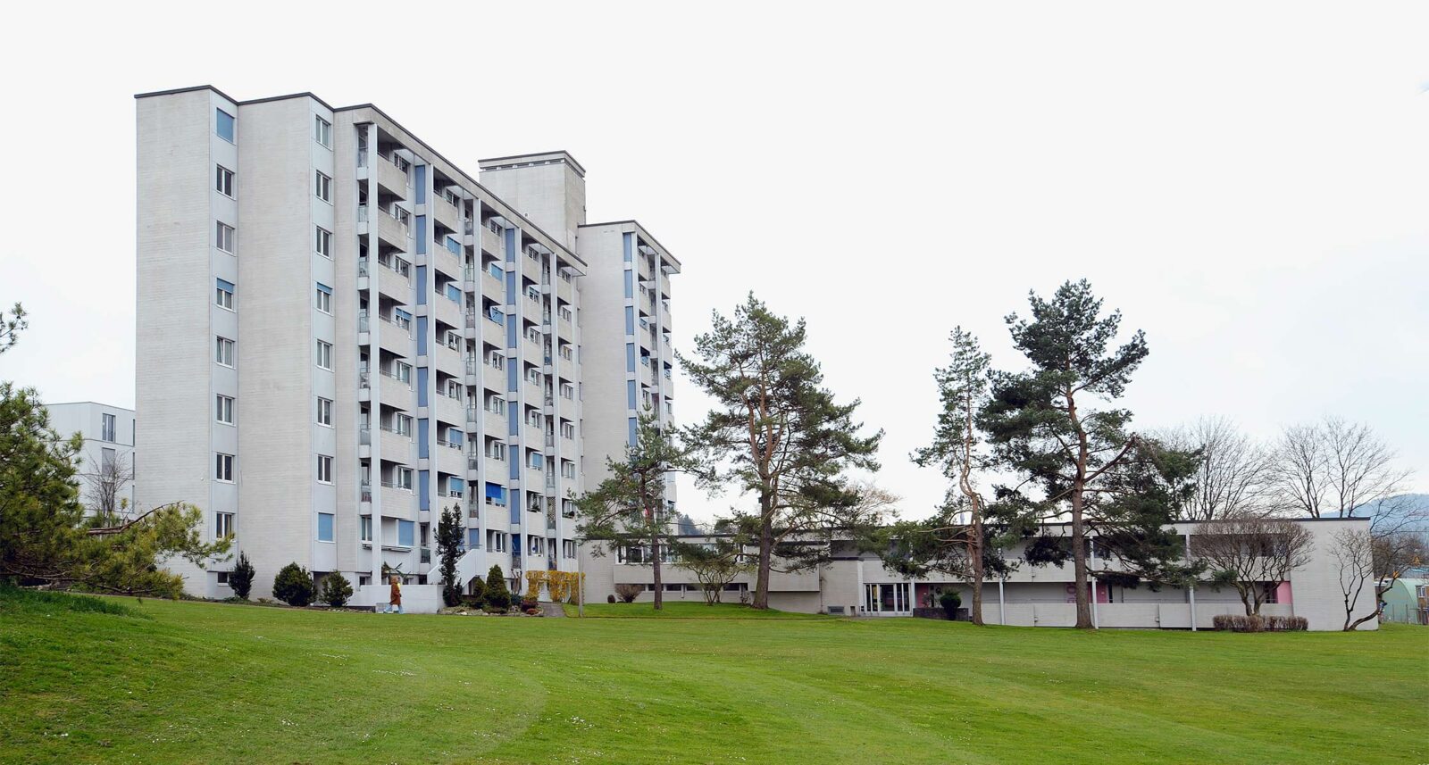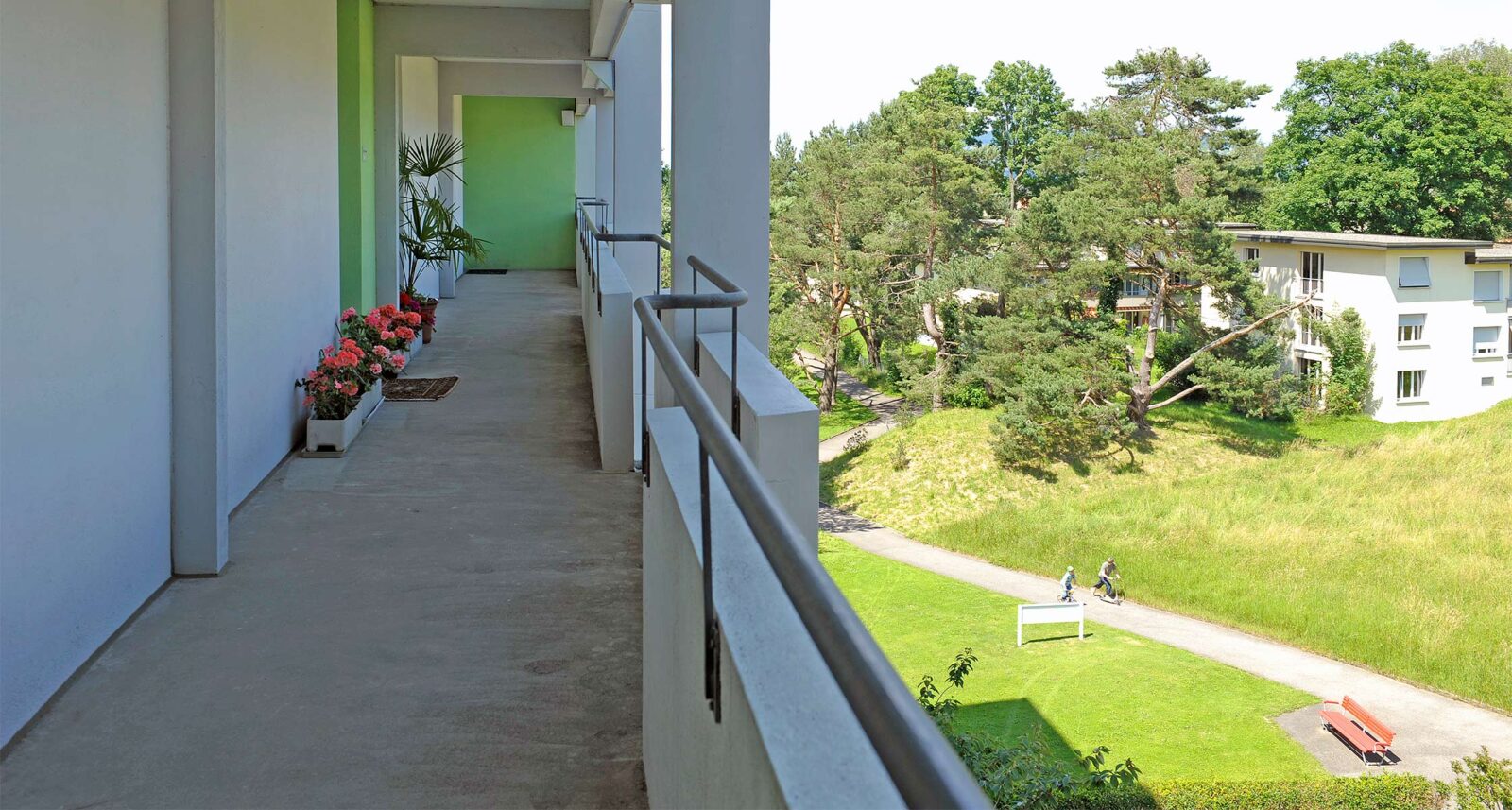 Die Siedlung liegt leicht erhöht auf dem Neubühl-Hügel und bietet ihren Mieter*innen einen schönen Rundumblick ins Grüne. Klare Formen bestimmen die Architektur, die von einer grossen Gartenanlage umgeben ist.