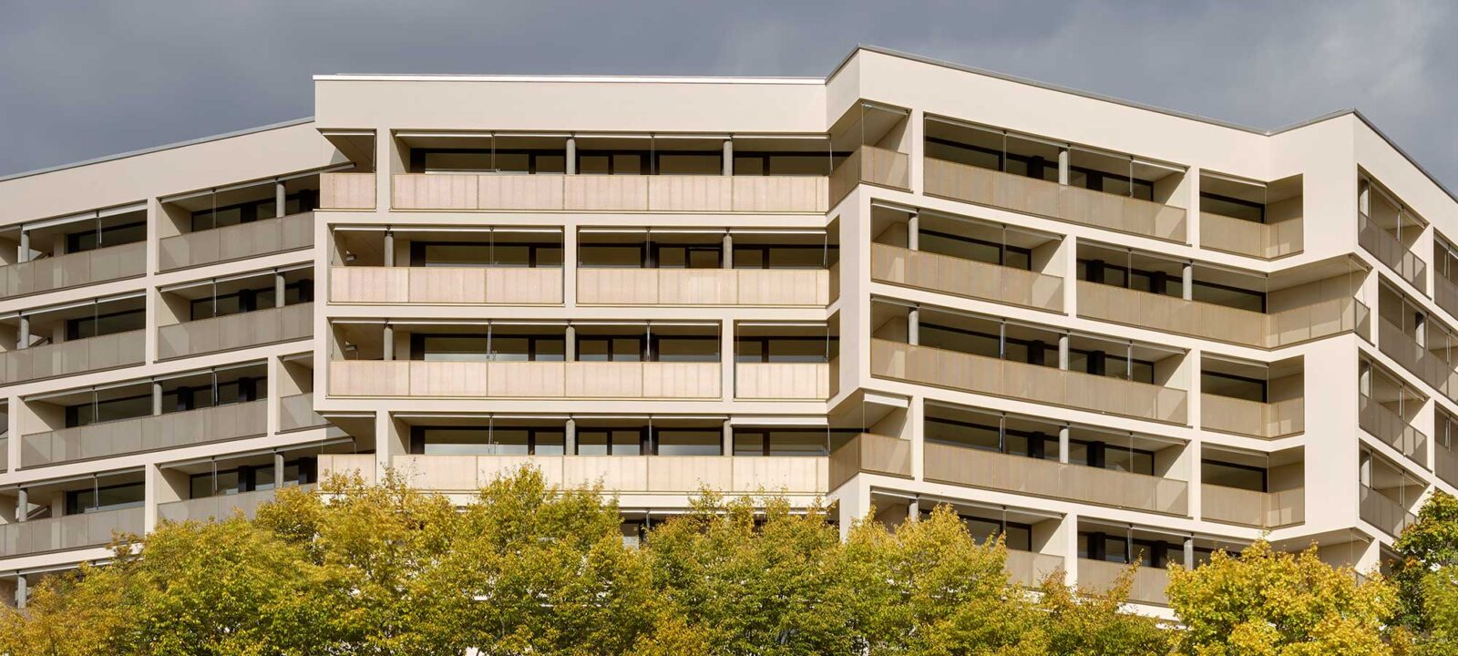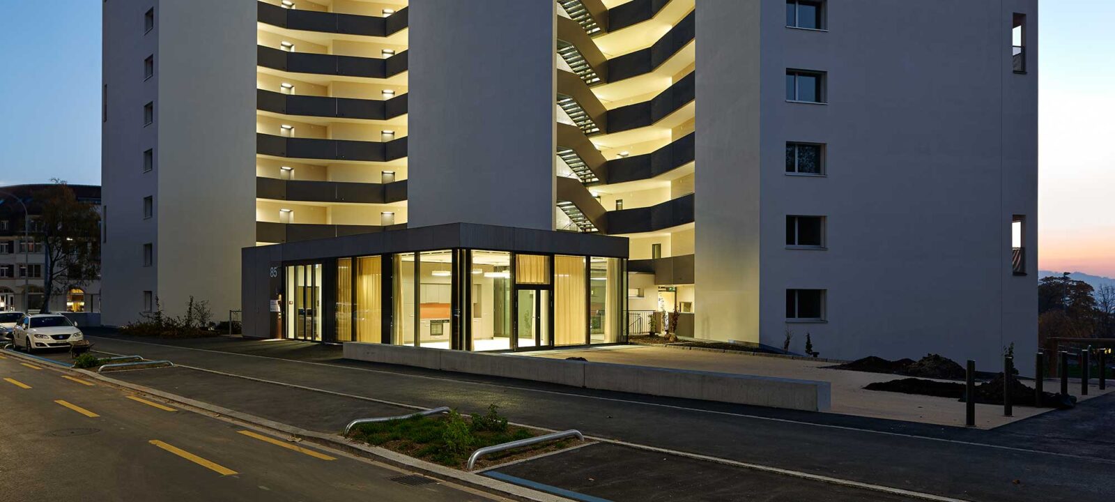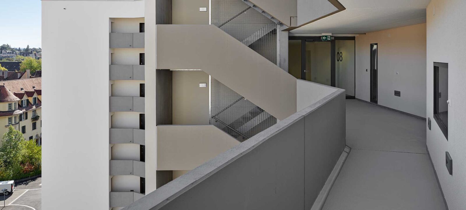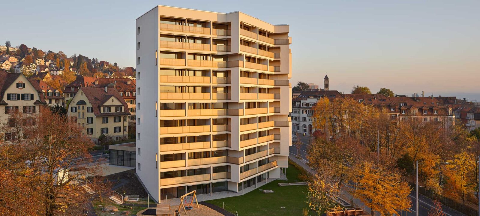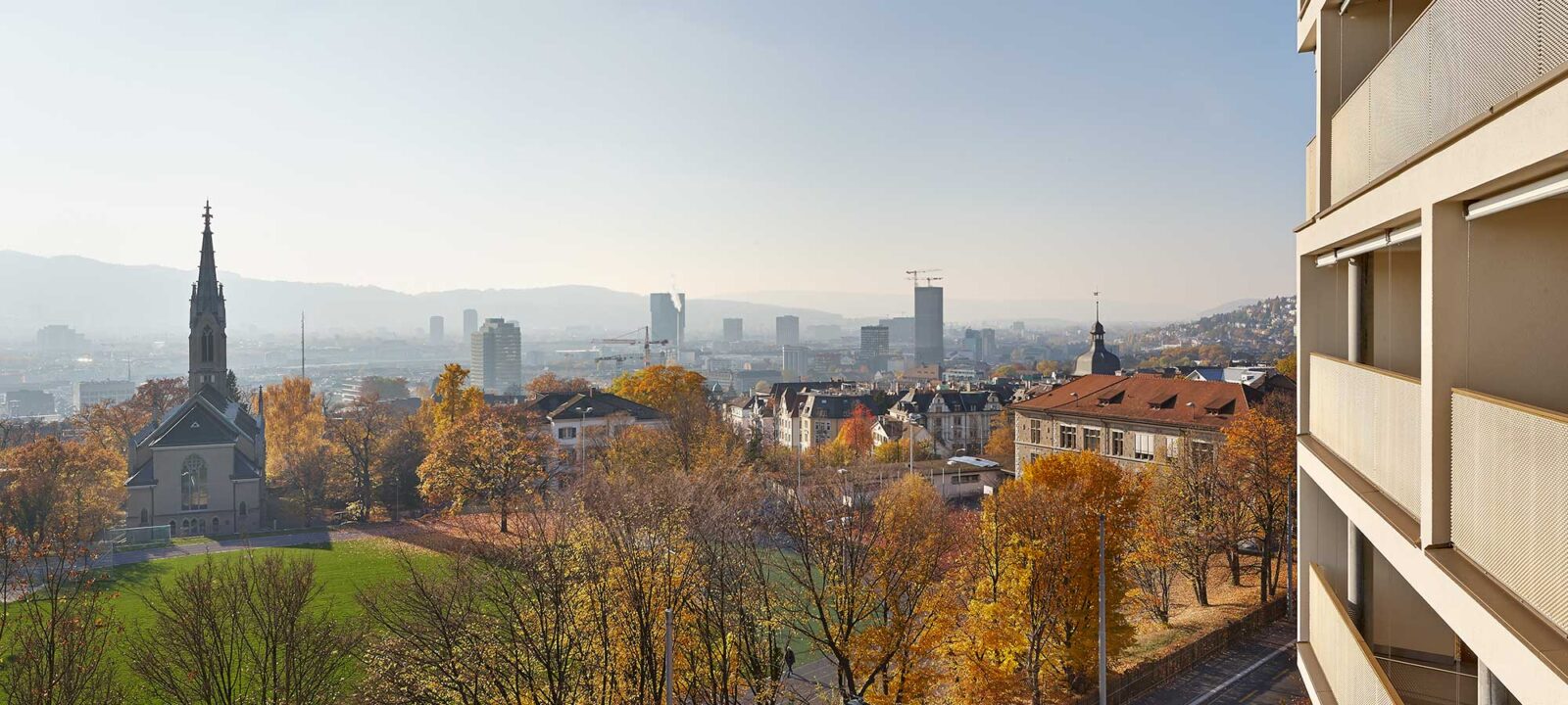 Die Siedlung Scheuchzerstrasse ragt über dem Schaffhauserplatz prägnant in die Höhe. Von ihren Wohnungen aus geniessen die Mieter*innen eine einmalige Sicht über die ganze Stadt – bei gutem Wetter sogar über den Zürichsee bis zu den Alpen.