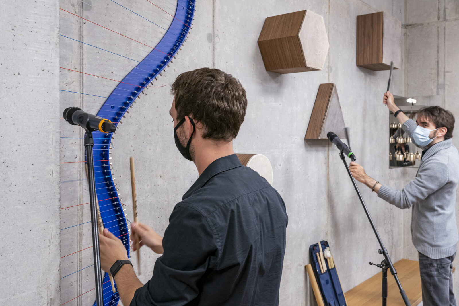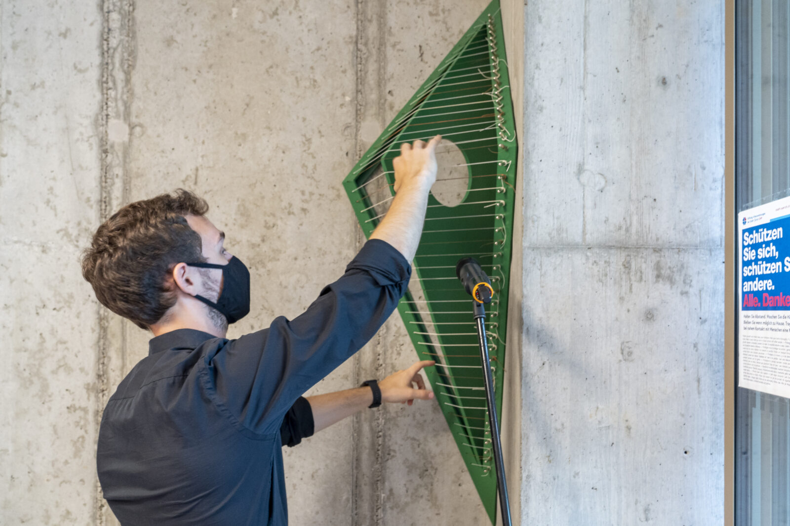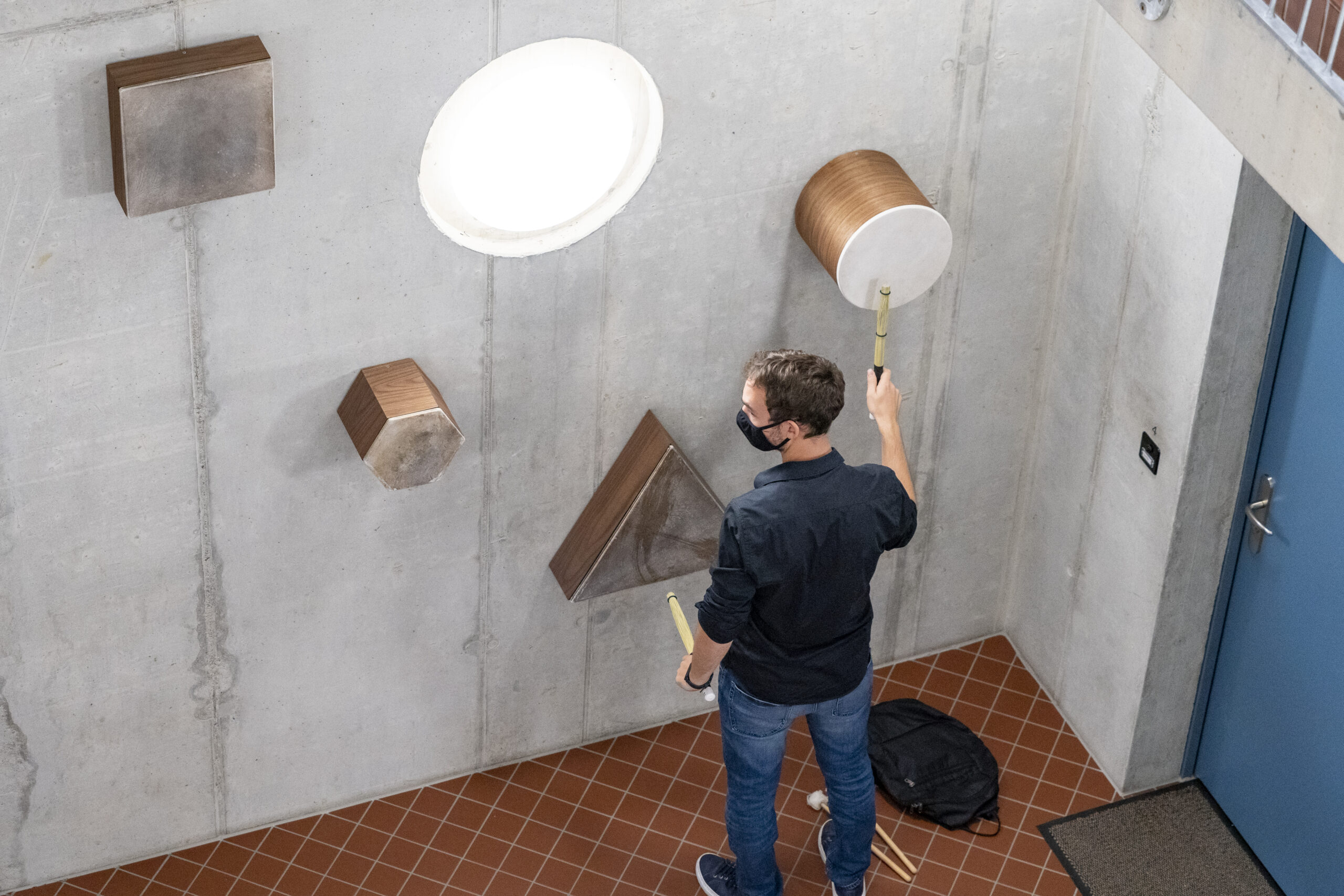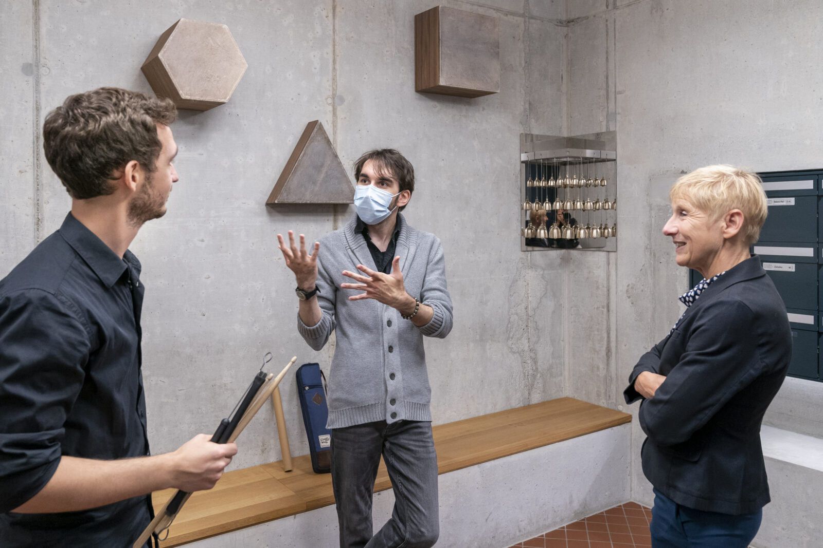 Die international bekannte Performancekünstlerin Nevin Aladağ aus Berlin hat für jeden der vier Eingangsbereiche bespielbare Kunst-Instrumente geschaffen: je ein Saiteninstrument, eine Gruppe unterschiedlich geformter Wandtrommeln und ein mit Spiegeln hinterlegtes Glockenspiel. Diese ungewöhnliche «Kunst am Bau» (kuratiert von Karin Frei Rappenecker, Art Agency) lädt nicht nur zum Betrachten, sondern auch zur spontanen Benutzung ein. Wie die Instrumente klingen, demonstrierten an der «Mini-Eröffnung» die beiden Musiker Leo Marcionetti (Saiten- und Zupfinstrumente) und Hannes Wittwer (Schlaginstrumente und Glockenspiel). In Zukunft wird es den Mieterinnen und Mietern sowie ihren Besuchern überlassen sein, wie und wann die musikalische Installation zu hören sein wird.