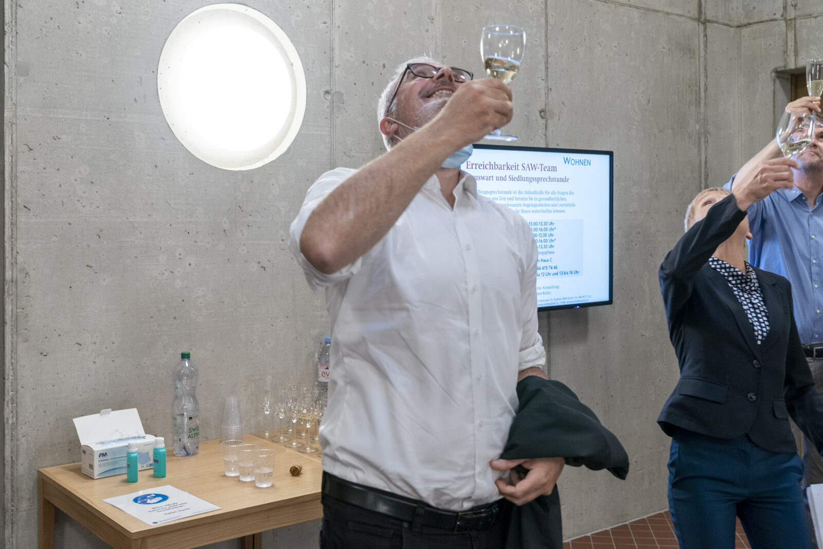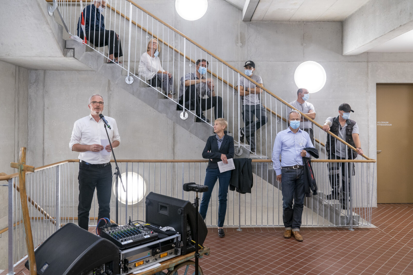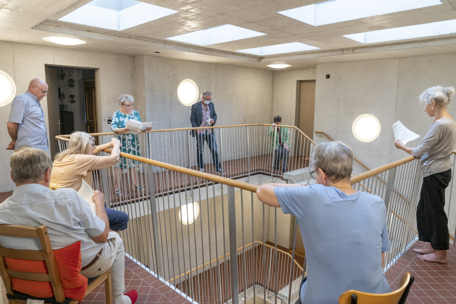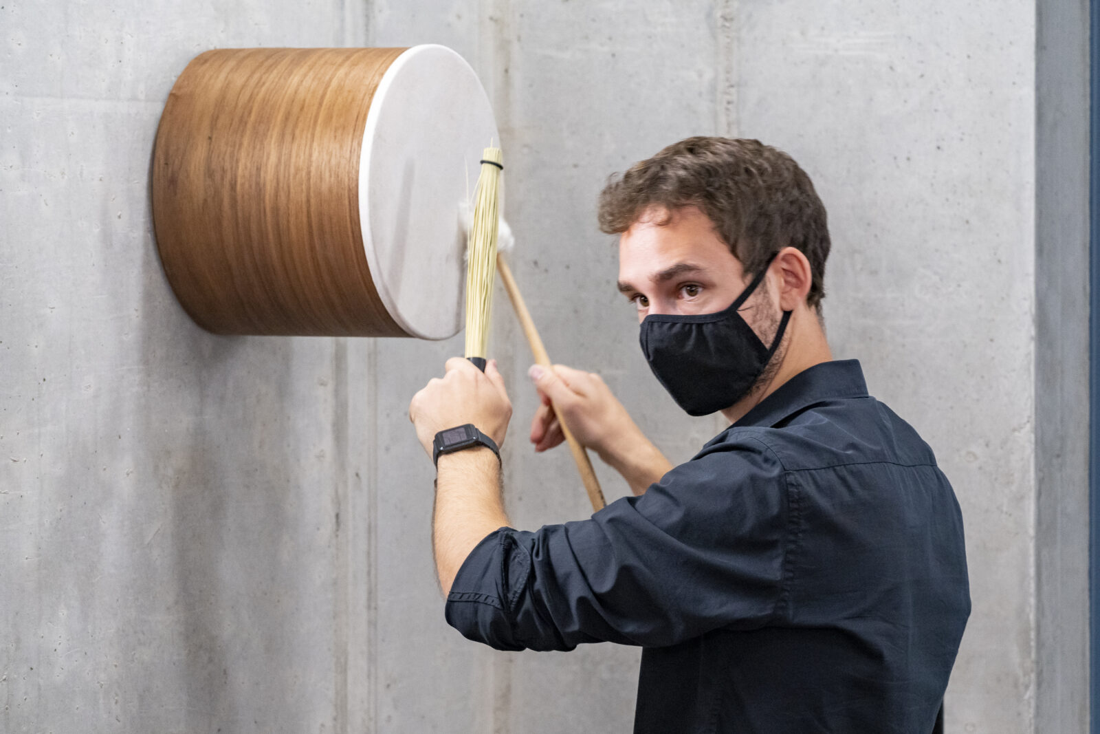 Die international bekannte Performancekünstlerin Nevin Aladağ aus Berlin hat für jeden der vier Eingangsbereiche bespielbare Kunst-Instrumente geschaffen: je ein Saiteninstrument, eine Gruppe unterschiedlich geformter Wandtrommeln und ein mit Spiegeln hinterlegtes Glockenspiel. Diese ungewöhnliche «Kunst am Bau» (kuratiert von Karin Frei Rappenecker, Art Agency) lädt nicht nur zum Betrachten, sondern auch zur spontanen Benutzung ein. Wie die Instrumente klingen, demonstrierten an der «Mini-Eröffnung» die beiden Musiker Leo Marcionetti (Saiten- und Zupfinstrumente) und Hannes Wittwer (Schlaginstrumente und Glockenspiel). In Zukunft wird es den Mieterinnen und Mietern sowie ihren Besuchern überlassen sein, wie und wann die musikalische Installation zu hören sein wird.