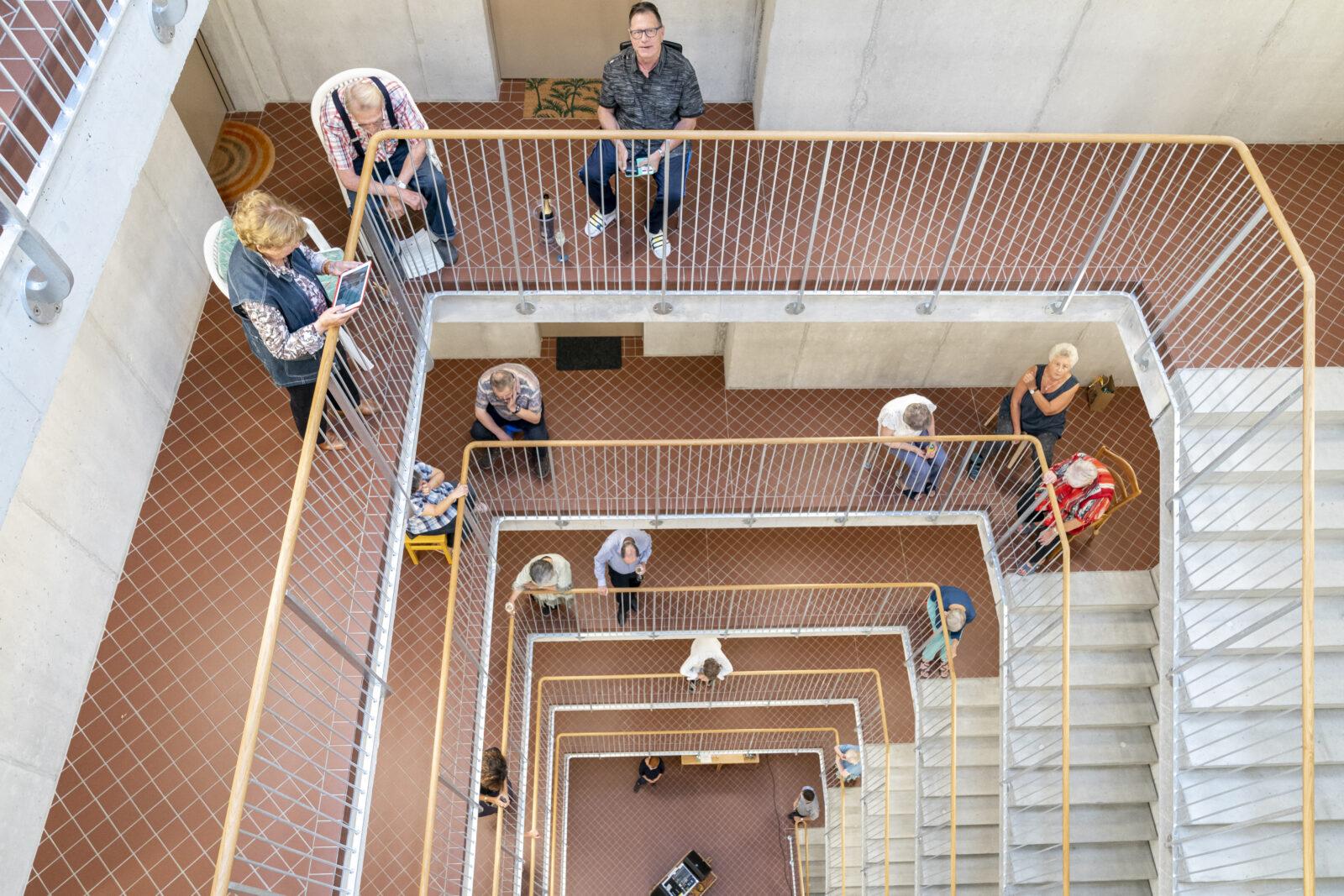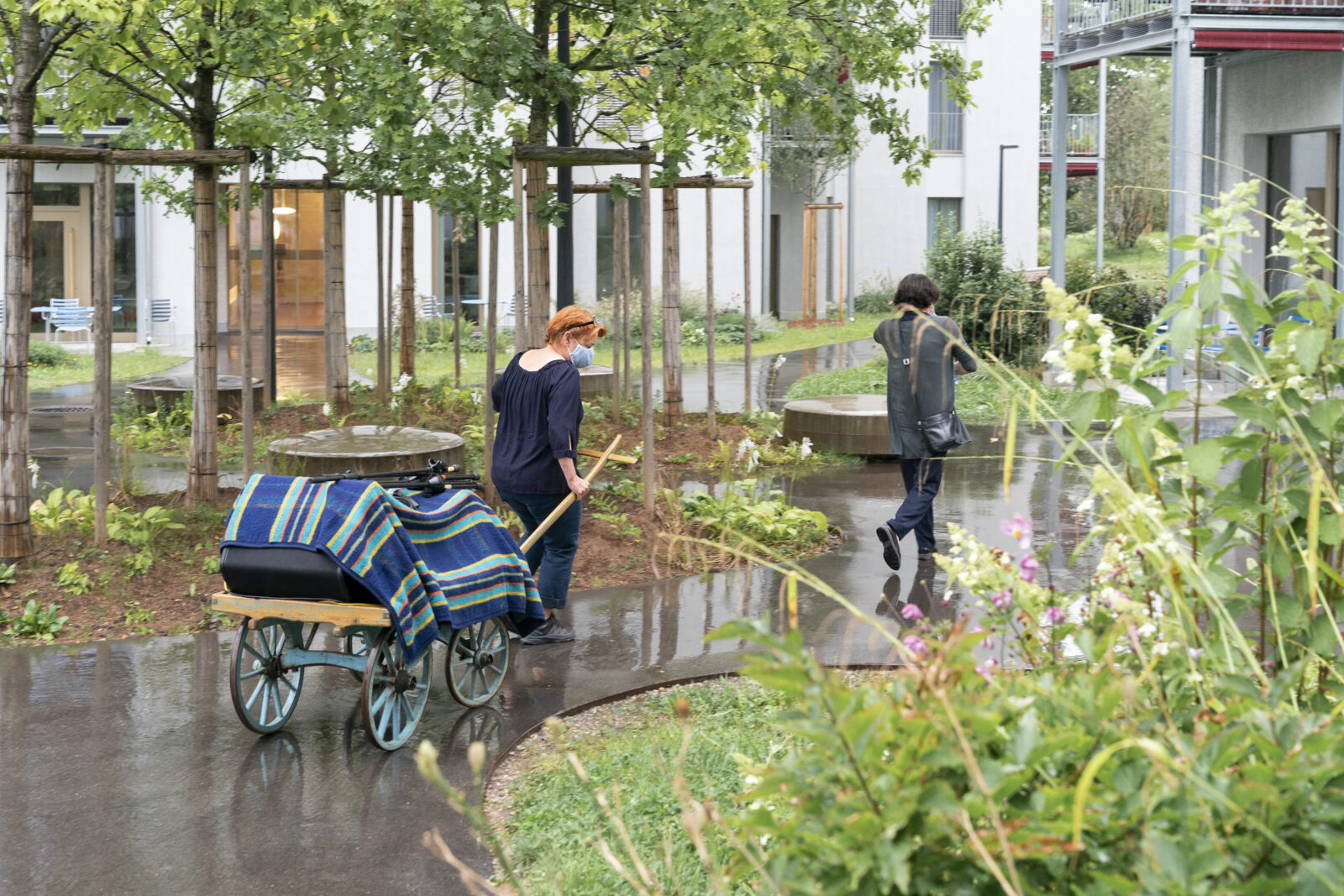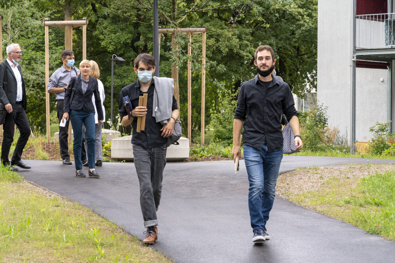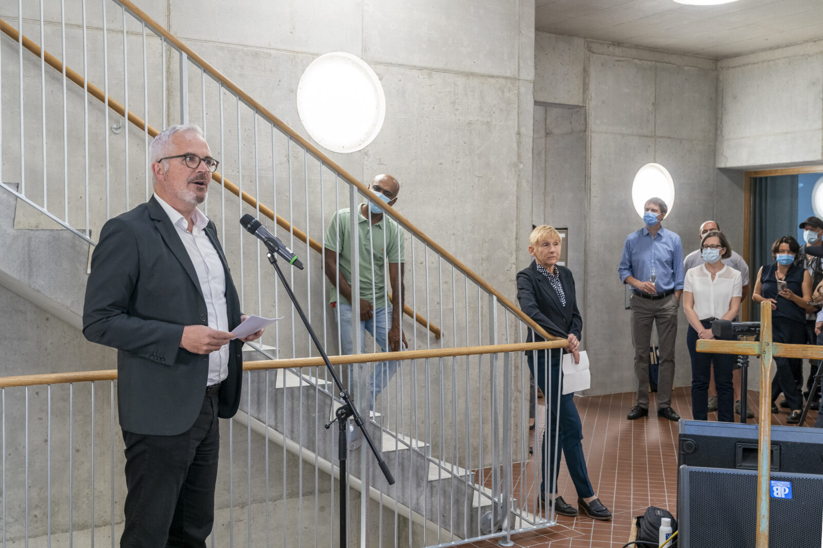 Die international bekannte Performancekünstlerin Nevin Aladağ aus Berlin hat für jeden der vier Eingangsbereiche bespielbare Kunst-Instrumente geschaffen: je ein Saiteninstrument, eine Gruppe unterschiedlich geformter Wandtrommeln und ein mit Spiegeln hinterlegtes Glockenspiel. Diese ungewöhnliche «Kunst am Bau» (kuratiert von Karin Frei Rappenecker, Art Agency) lädt nicht nur zum Betrachten, sondern auch zur spontanen Benutzung ein. Wie die Instrumente klingen, demonstrierten an der «Mini-Eröffnung» die beiden Musiker Leo Marcionetti (Saiten- und Zupfinstrumente) und Hannes Wittwer (Schlaginstrumente und Glockenspiel). In Zukunft wird es den Mieterinnen und Mietern sowie ihren Besuchern überlassen sein, wie und wann die musikalische Installation zu hören sein wird.